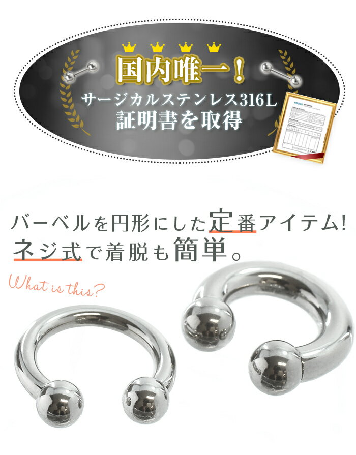 ●金属アレルギー対応 ROQUEのサーキュラーバーベルは アレルギー反応が起きにくい素材の サージカルステンレス316Lを使用していて 国内で唯一の証明書を取得しているんです ●内径サイズが細かく選べる 内径サイズは約14mm〜約18mmから 選べちゃいます! ◆SPEC◆ オススメ部位 耳たぶ・イヤーロブ・etc サイズ 2G(軸の太さ約6.0mm) 素材 サージカルステンレス316L (医療用ステンレス) 内径 約14mm/約16mm/約18mm カラー シルバー ご注意 【こちらのアイテムは1つでの販売となります】 ※両耳に着用される際は2つご購入が必要となります ※入荷時期によりカラー・内径サイズが若干変更になる場合がございます ※入荷時期によりボールキャッチのサイズが異なる場合がございます ※商品撮影時には、実物の色・形・質感を出来る限り、再現できるよう細心の注意を払っておりますが ご使用の閲覧環境などにより、明るさ・色彩等が現物とは異なって見える場合がございます。