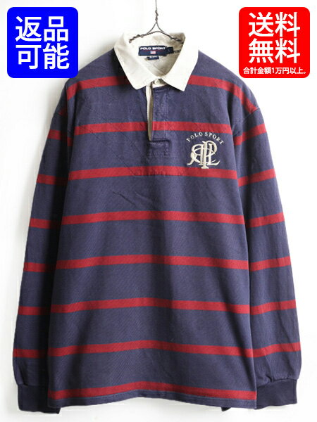 90's ■ POLO SPORT ポロスポーツ ラルフローレン 肩 キルティング 太 ボーダー 長袖 ラガーシャツ ( 男性 メンズ L ) 古着 ラグビー 紺| 【USA古着】中古 RALPH LAUREN 90年代 長袖シャツ ラグビーシャツ ラガー ネイビー バーガンディ ワンポイント ロゴ 刺繍 トップス
